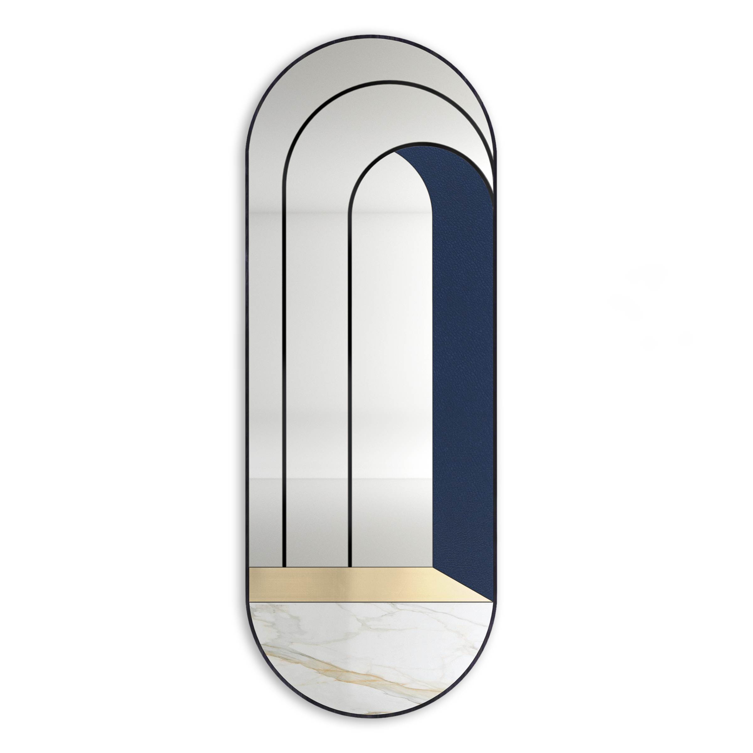 Combinando l'armoniosa venis del marmo Calacatta con la morbidezza della vera pelle blu e la lucentezza opaca dell'ottone spazzolato, questo splendido specchio simboleggia un viaggio attraverso infinite porte.